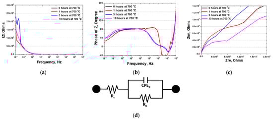 Electrochemical impedance spectroscopy from 106 to 10−2 with a heat treatment time of super duplex stainless steel AISI2507 in 3.5 wt% NaCl electrolyte solution at 700 °C; (a) phase of Z (Degree) vs. Frequency (Hz) curve, Nyquist plot, (b) IZI (Ohms) vs. frequency (Hz) curve, Nyquist plot, (c) Zim (Ohms) vs. Zre (Ohms) curve, Bode plot, and (d) EIS circuit with resistance change.