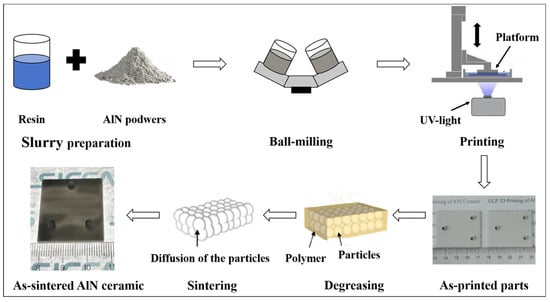 Schematic diagram of the experimental procedure for DLP 3D printing of AlN ceramic parts.