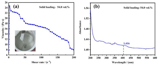 The solid loading of the AlN slurry was designed as 54.0 vol.%. The rheological and absorptance properties of the slurry were tested, as shown in Figure 2. It could be found in Figure 2a that the slurry exhibited non-Newtonian fluid and satisfied the shear-thinning behavior. The viscosity at 100 s−1 was about 16.8 Pa·s, which was suitable for spreading out uniformly but not flowing around on the foil with the scraper’s assistance. The curve in Figure 2b illustrated that the light absorbance of the slurry was tested to be 1.416 at 405 nm, which was due to the high light absorptance of AlN particles and the large difference in refractive indexes between AlN and resin monomers.
