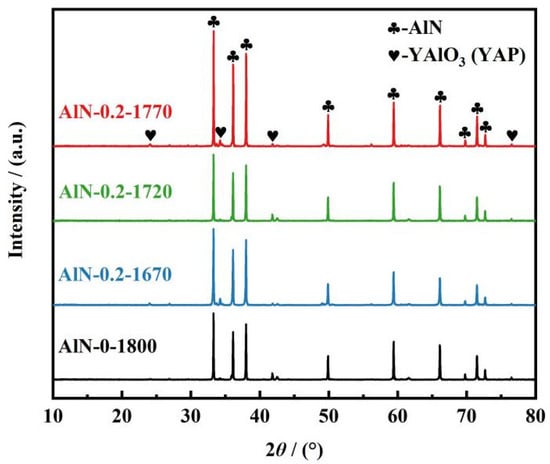 In the present work, a nitrogen-gas pressure-assisted sintering method (under a lower nitrogen-gas pressure of <1 MPa) was proposed to promote the densification of the 3D-printed AlN ceramic parts. In order to determine the optimal sintering temperature, the degreased samples were subsequently densified via sintering at different temperatures of 1670, 1720, and 1770 °C for 4 h with the assistance of a nitrogen pressure of 0.2 MPa. For comparison, a traditional pressure-less sintering method was also conducted at 1800 °C in a flowing nitrogen atmosphere to fabricate dense AlN ceramics. XRD patterns of all the samples sintered in different conditions are presented in Figure 4. Diffraction peaks representing AlN and YAlO3 (YAP) phases were found in all of the AlN ceramics fabricated using different sintering methods; the Y2O3 phase was not detected, indicating that the added sintering agent Y2O3 participated in the reaction with Al2O3 to form YAP, thus the densification of AlN ceramics was promoted, and the lattice oxygen was partially eliminated [28]. The elimination of lattice oxygen was recognized to be of significant importance to the enhancement of the thermal conductivity of AlN ceramics [29].