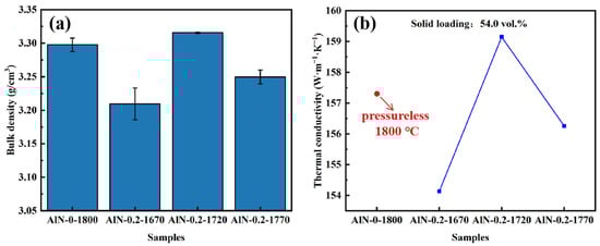 (a) bulk density and (b) thermal conductivity of AlN ceramic samples: AlN-0-1800, AlN-0.2-1670, AlN-0.2-1720, and AlN-0.2-1770.