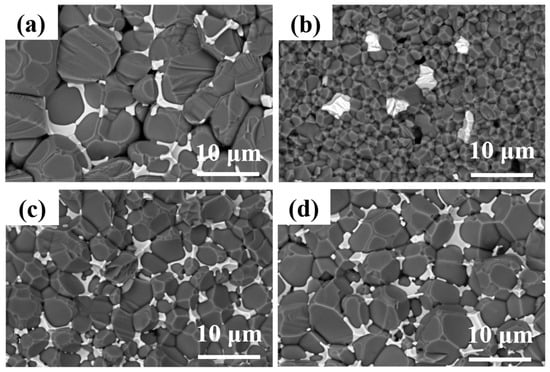 SEM micrographs of AlN ceramic samples: (a) AlN-0-1800, (b) AlN-0.2-1670, (c) AlN-0.2-1720, (d) AlN-0.2-1770.
