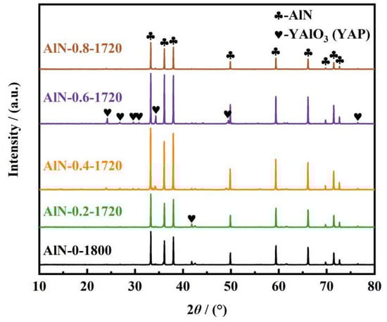 To investigate the effect of nitrogen pressure on the densification of AlN ceramics, in the case that the sintering temperature was determined to be 1720 °C, another three groups of degreased samples were sintered with the assistance of 0.4, 0.6, and 0.8 MPa nitrogen pressure, respectively. It could be observed in Figure 7 that all AlN ceramic samples were composed of AlN and YAP phases. The relative intensity of the crystalline peaks of YAP was the highest for the AlN-0.6-1720 ceramic. However, the XRD results of the sample sintered at 0.8 MPa showed faint crystalline peaks of YAP.