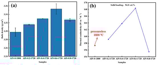 (a) bulk density and (b) thermal conductivity of AlN ceramic samples: AlN-0-1800, AlN-0.2-1720, AlN-0.4-1720, AlN-0.6-1720, and AlN-0.8-1720.
