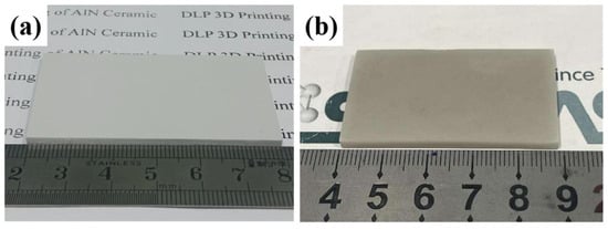 In order to demonstrate the possibilities opened up by a joint process of DLP 3D printing and the gas pressure-assisted sintering method, the sintering temperature and gas pressure were determined to be 1720 °C and 0.6 MPa, respectively, large-sized and complex-shaped AlN ceramic parts were further fabricated. Figure 10a shows the appearance of a 3D printed AlN green body with a size of 59 mm × 34 mm × 4 mm; the as-sintered sample shown in Figure 10b has a size of about 49 mm × 28 mm × 3 mm. As can be observed from the images, the surfaces of the green bodies and sintered components were uniform without defects such as cracking, transformation, and large amounts of porosity, demonstrating that the proposed gas pressure-assisted sintering method could be applied to fabricate 3D-printed large-sized AlN ceramic parts.