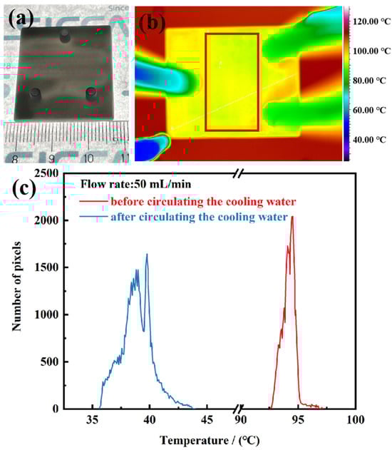 (a) The 3D printed AlN ceramic heat sink with an internal mini-channel structure, (b) infrared thermal imaging of the ceramic heat sink with flowing water attached to the heating stage at 110 °C, and (c) temperature distribution in the rectangular area before and after circulating a certain flux of 50 mL/min cooling water.