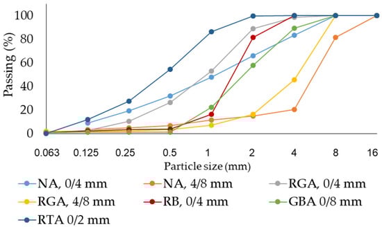 - Natural aggregates as well as aggregates from recycled waste were characterized by determining the particle size distribution curve according to EN 933-1 [], bulk density and intergranular porosity according to EN 1097-3 [], and true mass and water absorption coefficient according to EN 1097-6 [], as shown in Figure 1, Figure 2, Figure 3 and Figure 4. Additionally, for blast furnace slag (GBA), the oxide composition was determined by X-ray fluorescence (XRF) analysis (Table 1). The textolite slag was analyzed for residual metal content (Table 2) according to the methodology indicated in specific standard documents [,,,].