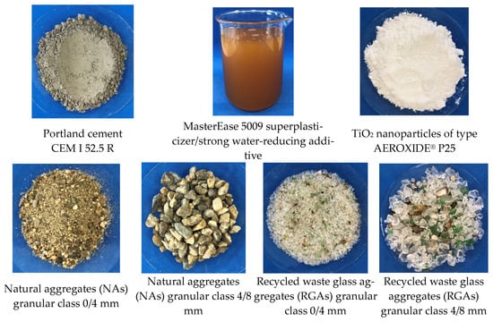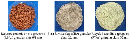 Motivated by the above, the aim of this work was to perform an analysis of the influence that the addition of TiO2 nanoparticles has on the physical–mechanical performance in correlation with microstructurally induced changes in cementitious composites in which natural aggregates are partially substituted by aggregates derived from recycled waste glass (RGA), recycled ceramic brick (RBA), blast furnace slag (GBA), and textolite (RTA) derived from the non-metallic waste of electronic equipment.