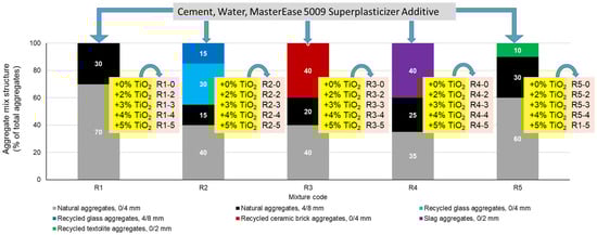 In the next step, for each designed mixture in which natural aggregates were substituted by recycled waste aggregates, compositional variants were developed in which 2%, 3%, 4%, or 5% TiO2 nanoparticles were added as a mass percentage of the cement quantity. In total, 25 mixtures of cementitious composites were designed and developed. Figure 6 shows the raw materials used, the compositional structure of the aggregates, the amount of NTs added, and the identification code of the compositions according to the types of aggregates and NT content.