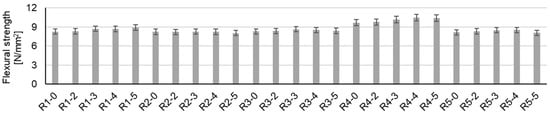 In terms of flexural tensile strength (Figure 9), the results show less obvious improvements with NTs, but in a similar trend to the compressive strength. Thus, the greatest increases in flexural strength can be identified from 8.27 N/mm2 (R1-0) to 8.92 N/mm2 (R1-5) for NA compositions; from 8.24 N/mm2 (R2-0) to 8.28 N/mm2 (R2-3) for RGA compositions; from 8.31 N/mm2 (R3-0) to 8.64 N/mm2 (R3-3) for RBA compositions; from 9.67 N/mm2 (R4-0) to 10.47 N/mm2 (R4-4) for GBA compositions; and from 8.15 N/mm2 (R5-0) to 8.51 N/mm2 (R2-4) for RTA compositions. As can be seen, the most favorable situations are also for additions of 3% or 4% NTs (mass percentage, relative to the amount of cement).