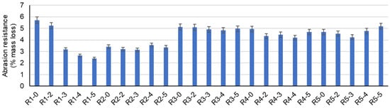 Abrasion mass loss, the indicator inversely proportional to abrasion resistance (Figure 10 and Table 4), is also influenced by both the nature of the aggregates and the addition of NTs. Thus, in the case of composites with NAs, there is an increasing improvement in abrasion resistance with the increasing addition of NTs, with the best performance for 5% NTs (by mass, relative to the amount of cement). However, this trend is not maintained for the composites in which NAs were partially substituted by recycled waste aggregates, with the most favorable results (lowest mass loss) for 3% or 4% NTs (mass, relative to the amount of cement) as follows: 8.21% decrease in mass loss compared to the control composition (R2-0) for 3% NTs in the composition with RGAs (R2-3); 5.66% decrease in mass loss compared to the control composition (R3-0) for 4% NTs in the composition with RBAs (R3-4); 15% decrease in mass loss compared to the control composition (R4-0) for 4% NTs in the composition with GBAs (R4-4); and 9.62% decrease in mass loss compared to the control composition (R5-0) for 3% NTs in the composition with RTAs (R5-4). A notable phenomenon was observed in the case of composites prepared using only NAs, where wear resistance increased significantly with the increase in the amount of NTs. This observation is consistent with the results reported in the literature and corresponds to the increasing trends observed for compressive and flexural strength and the decreasing trend for water absorption. These results support the hypothesis of matrix densification in the composite as a result of the addition of NTs. Despite the less pronounced improvement trends observed for compressive and flexural strength, it is noteworthy that these behaviors are underpinned by microstructural phenomena such as porosity and microcracking, which are likely to be more pronounced within the bulk rather than the surface layer of the specimen. This surface layer is subjected to abrasion, whereas the entire bulk of the composite is subjected to loading in the case of the other two strength properties.