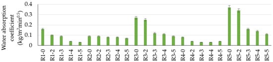 From the point of view of water behavior and the coefficient of water absorption by capillarity (Figure 11 and Table 4), it is influenced by both the nature of the aggregates and the addition of NTs. On the one hand, the substitution of natural aggregates with those from waste induces an increase or decrease in water absorption, depending on their nature. Thus, the partial substitution of natural aggregates (NAs) with aggregates from glass waste (RGA) or slag (GBA) leads to an improvement in this performance; the water absorption coefficient by capillarity decreases compared to the composition containing only natural aggregates (R1-0), while the aggregates from ceramic brick waste (RBA) or textolite (RTA) have the reverse effect. With the introduction of TiO2 nanoparticles in cementitious compositions, an improvement in this performance is observed for all analyzed cases, more so as the addition is higher. It is also noted that the use of NTs can counteract the negative effects of ceramic brick waste aggregates (RBAs) or textolite (RTA), the most significant reductions in the indicator being recorded in these situations. In the case of brick waste (RBA) or textolite (RTA), it is assessed that 3% NTs can lead to a composition with a water absorption coefficient approximately equal to or even slightly better compared to that of a composition with natural aggregates (0.12 kg/m2min0.5 for R3-3 and 0.16 kg/m2min0.5 for R5-3 compared to 0.16 kg/m2min0.5 for R1-0).