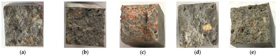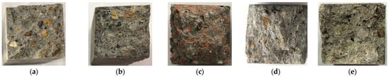Section appearance of cementitious composites made with NT-exemplary images. (a) Cementitious composite with NA, R1-3; (b) Cementitious composite with NA partially substituted with RGA, R2-3; (c) Cementitious composite with NA partially substituted with RBA, R3-4; (d) Cementitious composite with NA partially substituted with GBA, R4-3; (e) Cementitious composite with NA partially substituted with RTA, R5-4.