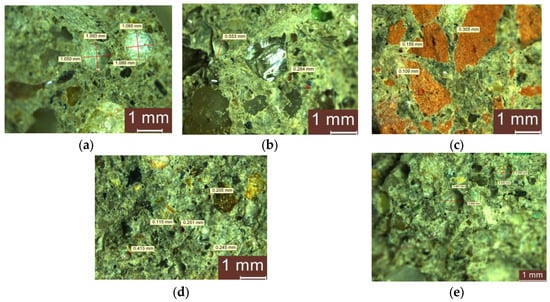 When NTs are introduced into the composite mass, a reduction in pore size is observed in the range of 0.25–0.8 mm for compositions prepared with NAs only and with 2–5% NTs. For composites with 2–5% NT and RGA content, the pore dimensions are in the range of 0.15–0.51 mm; for composites with RBA content, the pore dimensions are in the range of 0.12–0.30 mm; for composites with GBA content, the pore dimensions are in the range of 0.10–0.45 mm; and for composites with RTA content, the pore dimensions are in the range of 0.50–0.85 mm. Example images are shown in Figure 15. Based on these observations, a decrease in pore size can be seen, which is less pronounced in the case of composites with RBA or GBA and more pronounced in the case of composites with NA, RGA, and RTA.