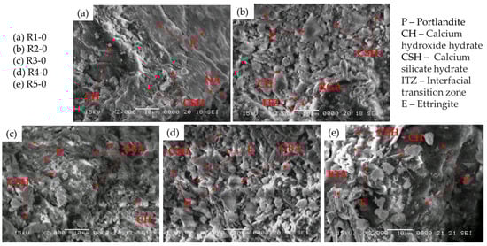 Figure 16 depicts the SEM images of the cementitious composite with NA (Figure 16a) and the cementitious composites with NA partially substituted with RGA (Figure 16b), RBA (Figure 16c), GBA (Figure 16d), and RTA (Figure 16e).