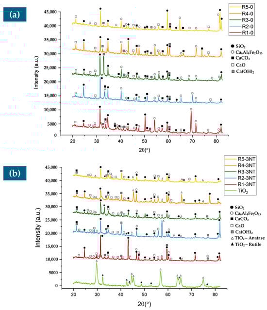 Figure 19 presents the comparison XRD patterns of the samples without NTs, R1-0 to R5-0 (Figure 19a), and the samples containing 3% NTs, R1-3 to R5-3 (Figure 19b). Figure 19a reveals the presence of primary peaks characteristic of ordinary Portland cement, such as calcite—CaCO3 (present at 2θ = 25.2°, 31.5°, and 33.9°), aluminoferrite—Ca6Al4Fe2O15 (present at 2θ = 27.9°, 38.1°, and 55.4°), and portlandite—Ca(OH)2 (present at 2θ = 21.0°, and 40.2°). In addition, Figure 19b presents the XRD pattern for the anatase and rutile phases of the TiO2 nanoparticles. As it can be observed in the spectra for the samples R1-3 to R5-3, the presence of peaks specific for the anatase phase of the nano-TiO2 particles is noticeable at 2θ = 29.6°, 43.1°, 57.2°, and 64.1°. Several peaks corresponding to the rutile phase of the TiO2 nanoparticles can be observed in different spectra at 2θ = 32.5° for R3-3 and R5-3, 42.9° for R2-3, and 53.7° for R1-3 and R4-3. This underlines the lack of chemical interaction between the TiO2 nanoparticles and the cementitious matrix and the clear presence of a predominantly anatase phase in the samples containing 3% NTs.