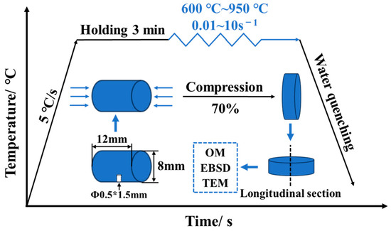 The ingot was processed into several cylindrical specimens with dimensions of Φ 8 mm × 12 mm. A small hole of Φ 0.5 mm × 1.5 mm was drilled at the center of the side of the cylinder to secure a thermocouple, thus preparing thermal compression samples for testing on a Gleeble-1500D thermal simulation testing machine. The selected deformation temperature range for the experiment was 600–950 °C, and the strain rate range was 0.01–10 s−1, with a total compressive true strain deformation of 70%. A schematic of the alloy’s thermal compression process is shown in Figure 1.
