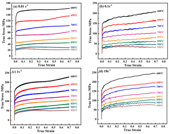 True stress–true strain curves of alloy at different strain rates: (a) ; (b) ; (c) ; and (d) .