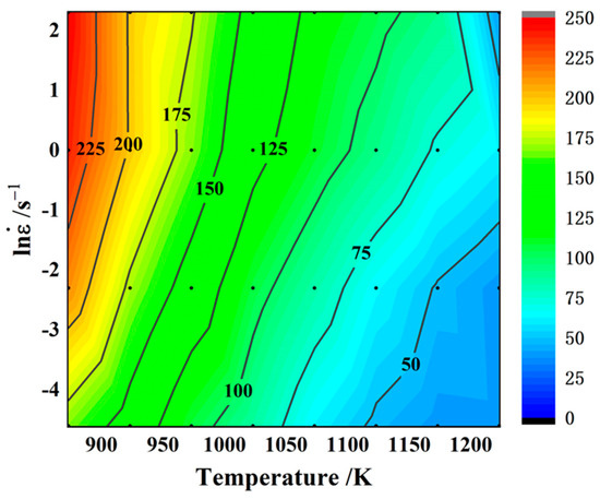 A1, n1, A2, β, A, α, and n are all material constants, and α = β/n1. For the σ in Equations (3)–(5), the peak stress, the steady-state rheological stress, and the instantaneous rheological stress corresponding to a certain strain variable can be expressed, and the following derivation process σ specifically refers to the peak stress σp. Figure 3 is the peak stress contour diagram of Cu–Cr–Sn alloys under different deformation conditions.