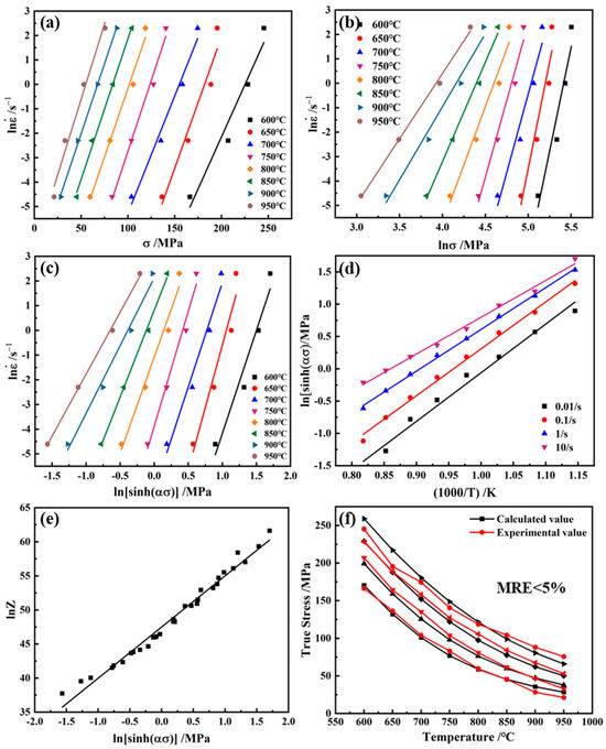 The stress values calculated by the constitutive equation are compared with the peak stress values, as shown in Figure 4f, with a relative average error of less than 5%.