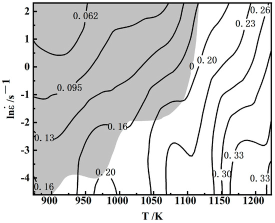 The region of ξ < 0 is divided into rheological instability regions, which are represented by gray color blocks. The thermal working diagram of the Cu–Cr–Sn alloy is obtained by plotting the instability map under the same deformation conditions and superimposing this part of the area on the power dissipation map, as shown in Figure 5.