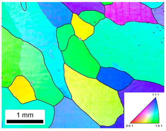The as-cast microstructure of the large-scale Cu–Cr–Sn alloy ingot exhibits larger equiaxed grains, which show the random orientation distribution, as shown in Figure 6.