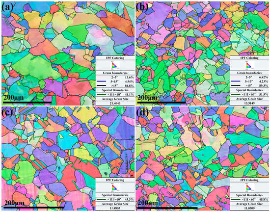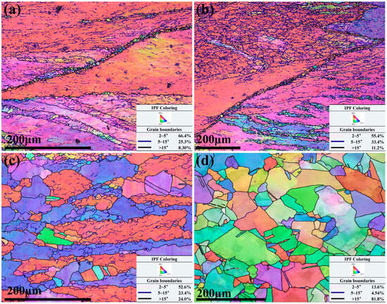 IPF maps of Cu–Cr–Sn alloy at a strain rate of 0.01 s−1 with (a) deformation temperature of 750 °C; (b) deformation temperature of 800 °C; (c) deformation temperature of 850 °C; and (d) deformation temperature of 900 °C.
