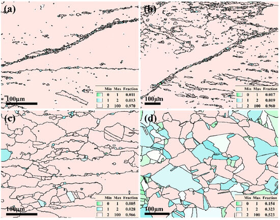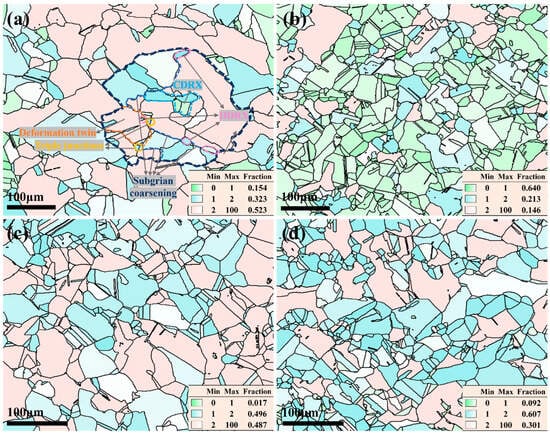 Under the same strain conditions, as the deformation temperature increases, the thermal activation is enhanced, and the grain boundary migration rate accelerates, which is conducive to the migration of new recrystallized grains out of the serrated grain boundaries of the original grains and their continued growth. The proportion of 2–5° subgrain boundaries gradually decreases, transforming into low-angle grain boundaries or even high-angle grain boundaries, and the proportion of high-angle grain boundaries greater than 15° gradually increases.
