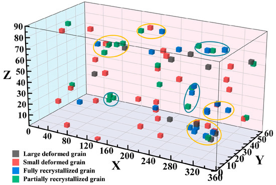 Gray cubes indicate large deformed grains, red cubes indicate small deformed grains, blue cubes indicate fully recrystallized grains, and green cubes indicate partially recrystallized grains, respectively. It can be observed that the orientation distribution of the small deformed grains is relatively random, and there are two main types of orientation distribution relationships between the fully recrystallized grains, partially recrystallized grains, and the deformed grains. One is as shown in the yellow circles, where the orientation of the recrystallized grains essentially remains consistent with that of the deformed grains, corresponding to DDRX in Figure 10a. The other is as shown in the blue circles, where new isolated orientations of recrystallized grains appear, corresponding to CDRX in Figure 10a. This indicates that under high deformation temperature and low strain rate, dynamic recrystallization is mainly dominated by DDRX, while some grains undergo CDRX.