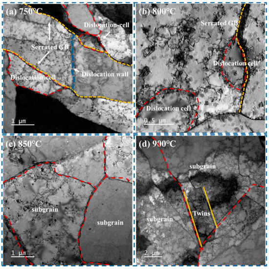 It can be seen from Figure 12a,b that fine new recrystallized grains appear along serrated grain boundaries at low deformation temperatures, and a significant amount of dislocation substructures still exist in the deformed grains, which shows a typical characteristic of discontinuous dynamic recrystallization (DDRX) [24,25,26,27]. This is in accordance with Figure 9a,b. With deformation temperature increasing, the intragranular dislocation density decreases, subgrain coalescence and rotation occur, and new large-angle grain boundaries are found, which are predominantly characterized by continuous dynamic recrystallization (CDRX) [28,29,30], as shown in Figure 12c. This is consistent with Figure 9c. In Figure 12d, in addition to changes in dislocation substructure, twins are produced at 900 °C, which corresponds to Figure 10a,b. This is consistent with Figure 9c,d.