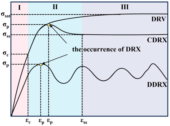 Stage I is the work hardening stage, the alloy undergoes softening in stage II, and in stage III, the alloy’s hardening and softening reach dynamic equilibrium. The curve DRV represents the stress–strain characteristic curve of dynamic recovery (DRV), which is similar to the curve of the Cu–Cr–Sn alloy deformed at 650–800 °C for all strain rates, as shown in Figure 2. Curve CDRX depicts deformation behavior under higher strain rates and lower deformation temperatures, which can be typically divided into three stages: The first stage is the work hardening stage before dynamic recrystallization occurs, serving as the preparatory phase for inducing dynamic recrystallization. The second stage is the partial dynamic recrystallization stage where the strain reaches the critical amount of deformation required for dynamic recrystallization to occur. As the strain increases, the slope of the curve decreases, and after the strain rises to its maximum value, the curve declines, indicating that dynamic recrystallization is intensifying. The third stage is the complete dynamic recrystallization stage where work hardening and recrystallization softening reach equilibrium, the curve levels off, and the flow stress approaches a constant value, achieving stable deformation, typically corresponding to continuous dynamic recrystallization (CDRX). The characteristic of curve CDRX is similar to the curve of the Cu–Cr–Sn alloy deformed at 900–950 °C for strain rate 0.01 s−1 and 1 s−1, as shown in Figure 2a,c. Curve III represents deformation behavior under low strain rates and higher deformation temperatures where the rate of increase in dislocation density is small. After dynamic recrystallization, further work hardening is required to accumulate dislocation density for recrystallization to occur again, resulting in a wavy curve. The feature of curve DDRX is similar to the curve of the Cu–Cr–Sn alloy deformed at 900–950 °C for strain rate 0.1 s−1, as shown in Figure 2b. This is the outcome of the repeated occurrence of dynamic recrystallization–deformation–dynamic recrystallization, a cycle of softening and hardening, typically corresponding to discontinuous dynamic recrystallization.