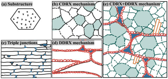 The schematic diagram of the evolution of the recrystallized organization during the hot deformation process. (a) Substructure; (b) CDRX mechanism; (c) triple junctions; (d) DDRX mechanism; and (e) CDRX+DDRX mechanism.
