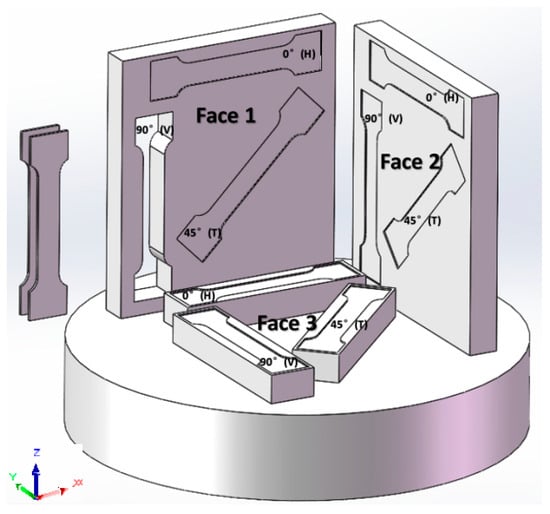The printed sample and pick-up position of the SLM are shown in Figure 2. In this paper, we refer to the XY plane as Face 3, which is perpendicular to the building direction. Additionally, we refer to the XZ plane as Face 1 and the YZ plane as Face 2; both are parallel to the building direction and perpendicular to each other. Specimens were taken from each surface in three directions: 0°, 45°, and 90°, with two specimens taken in each direction. The mechanical properties of the two samples taken from the same position are similar, and the stress-strain curves derived from the experimental data also exhibit similarity. Therefore, the stress-strain curves in the Results and Discussions section are derived from the data of the sample with superior mechanical properties.