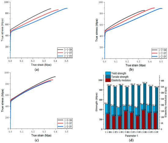 Parameter 1: (a) true stress-strain curves of three specimens on Face 1; (b) true stress-strain curves of three specimens on Face 2; (c) true stress-strain curves of three specimens on Face 3; (d) the yield strength, tensile strength, and elastic modulus of the specimen with parameter 1.