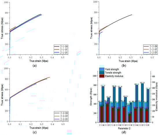 Parameter 2: (a) true stress-strain curves of three specimens on Face 1; (b) true stress-strain curves of three specimens on Face 2; (c) true stress-strain curves of three specimens on Face 3; (d) the yield strength, tensile strength, and elastic modulus of the specimen with parameter 2.