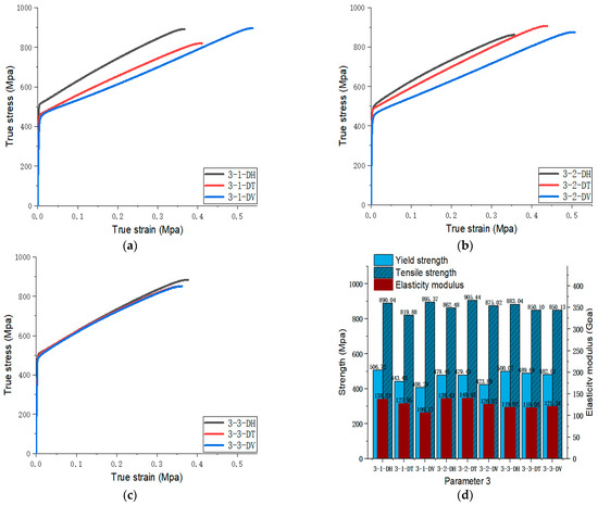 Parameter 3: (a) true stress-strain curves of three specimens on Face 1; (b) true stress-strain curves of three specimens on Face 2; (c) true stress-strain curves of three specimens on Face 3; (d) the yield strength, tensile strength, and elastic modulus of the specimen with parameter 3.