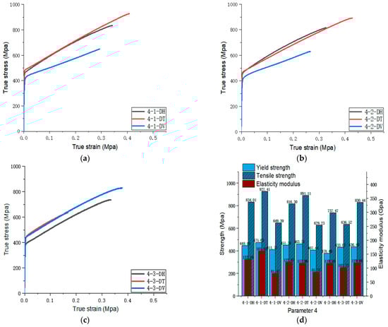 Parameter 4: (a) true stress-strain curves of three specimens on Face 1; (b) true stress-strain curves of three specimens on Face 2; (c) true stress-strain curves of three specimens on Face 3; (d) the yield strength, tensile strength, and elastic modulus of the specimen with parameter 4.