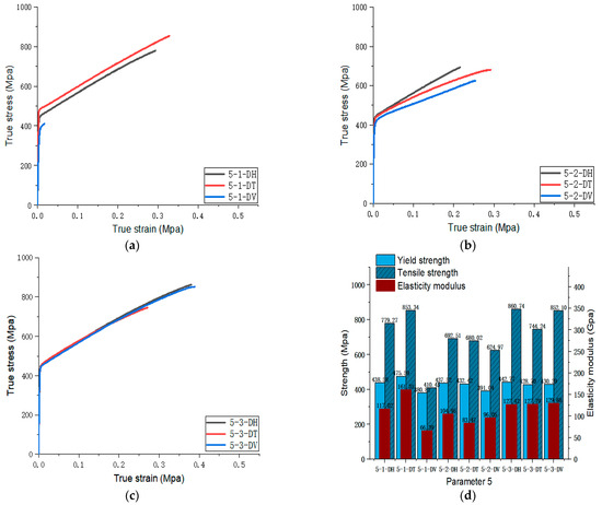 Parameter 5: (a) true stress-strain curves of three specimens on Face 1; (b) true stress-strain curves of three specimens on Face 2; (c) true stress-strain curves of three specimens on Face 3; (d) the yield strength, tensile strength, and elastic modulus of the specimen with parameter 5.