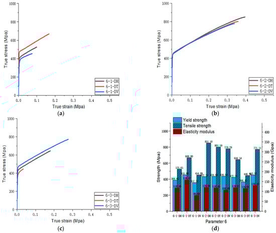 Parameter 6: (a) true stress-strain curves of three specimens on Face 1; (b) true stress-strain curves of three specimens on Face 2; (c) true stress-strain curves of three specimens on Face 3; (d) the yield strength, tensile strength, and elastic modulus of the specimen with parameter 6.