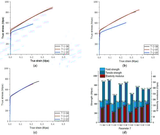 Parameter 7: (a) true stress-strain curves of three specimens on Face 1; (b) true stress-strain curves of three specimens on Face 2; (c) true stress-strain curves of three specimens on Face 3; (d) the yield strength, tensile strength, and elastic modulus of the specimen with parameter 7.