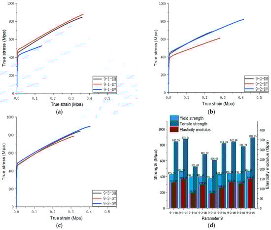 Parameter 9: (a) true stress-strain curves of three specimens on Face 1; (b) true stress-strain curves of three specimens on Face 2; (c) true stress-strain curves of three specimens on Face 3; (d) the yield strength, tensile strength, and elastic modulus of the specimen with parameter 9.