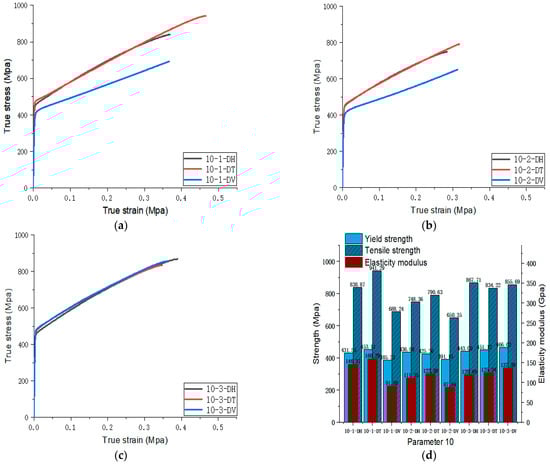 Parameter 10: (a) true stress-strain curves of three specimens on Face 1; (b) true stress-strain curves of three specimens on Face 2; (c) true stress-strain curves of three specimens on Face 3; (d) the yield strength, tensile strength, and elastic modulus of the specimen with parameter 10.