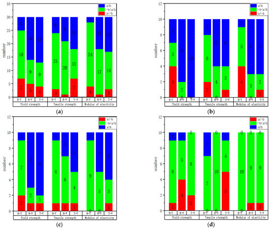 Statistical results of mechanical properties comparison of specimens with different directions on the same face: (a) complete specimens; (b) Face 1; (c) Face 2; (d) Face 3.