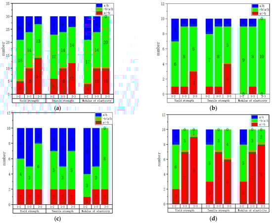 To better visualize the anisotropic laws of the mechanical properties, we compare the mechanical properties in the form of differences. The values of the mechanical properties are shown in Table A1. Here, given a criterion, when the difference in yield strength, tensile strength, and elasticity modulus between two specimens is less than 25 MPa, 100 MPa, and 25 GPa, respectively, we consider that their mechanical properties are close. In Figure 15 and Figure 16, the value of our judgment criterion is represented by ‘b’, and the actual value of the difference in mechanical properties is represented by ‘a’. From this criterion, we can see that a < (−b) (shown in red) indicates that the difference between the two mechanical properties is large, and the former is weaker than the latter; −b < a < b (shown in green) indicates that the difference between the two mechanical properties is not large; and a > b (shown in blue) indicates that the difference between the two mechanical properties is large, and the former is stronger than the latter.