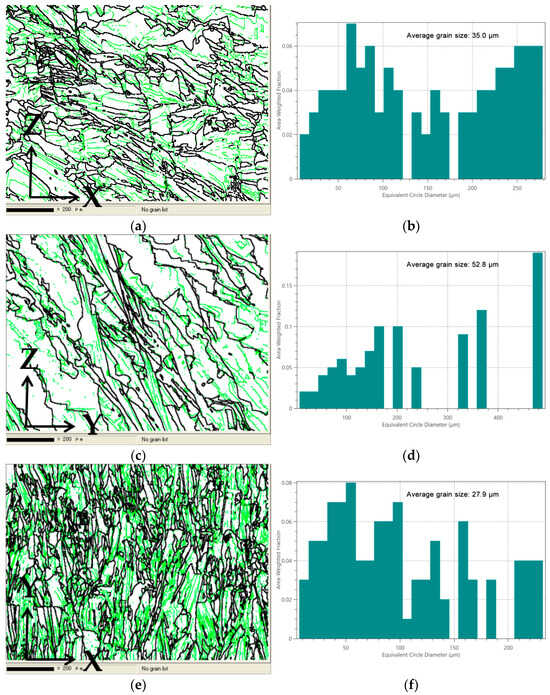 According to the Hall–Petch relation, the strength of the material increases as the crystal size decreases [31,32]. Smaller crystal size means more grain boundaries, which are the obstacles to dislocation movement. With an increase in the number of grain boundaries, dislocation movement requires higher stress, resulting in increased strength [14]. From Figure 17a–f, it is found that the grain size of Face 3 is significantly smaller than that of Face 1 and Face 2. The average grain sizes of Face 1, Face 2, and Face 3 are 35.0 µm, 52.8 µm, and 27.9 µm, respectively.