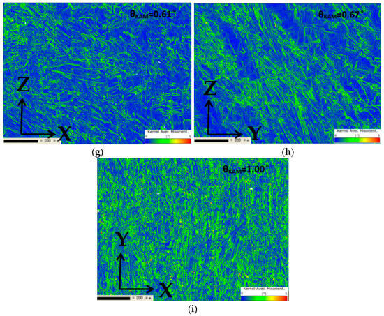 The dislocation structure is extremely important in adjusting the plastic deformation behavior of the sample [33]. The average orientation deviation can reflect the dislocation density [15]. The dislocation density increases with the increase in the average orientation deviation [15,34]. From Figure 17g–i, it can be seen that the dislocation density of Face 3 is significantly higher than that of Face 1 and Face 2. The average orientation deviations (θKAM) of Face 1, Face 2, and Face 3 are 0.61°, 0.67°, and 1.00°, respectively.