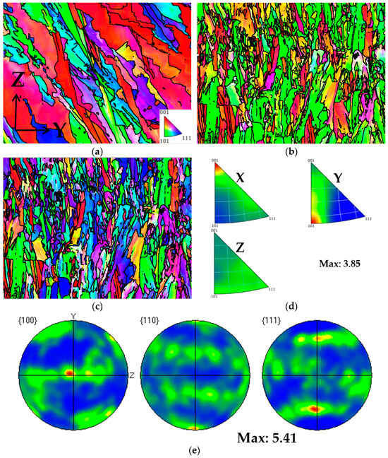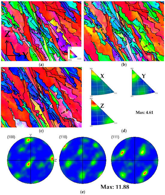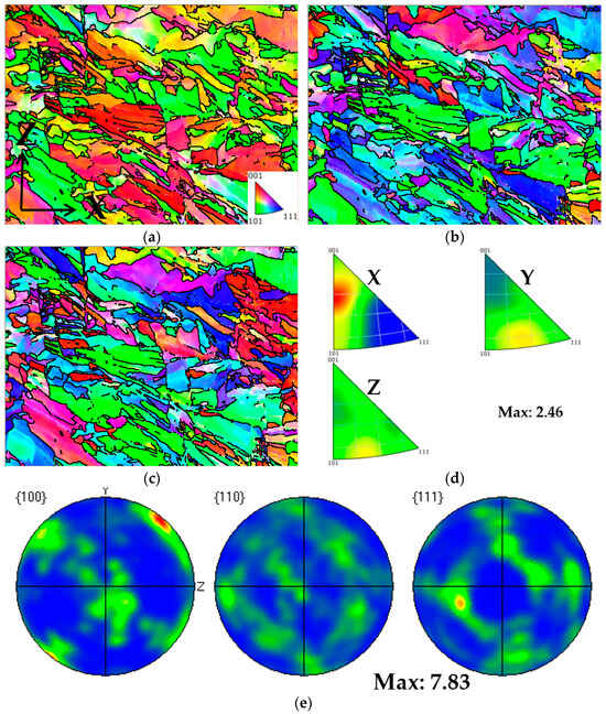Texture analysis of Face 1: (a) IPF coloring map parallel to X; (b) IPF coloring map parallel to Y; (c) IPF coloring map parallel to Z; (d) IPF maps; (e) pole figures.