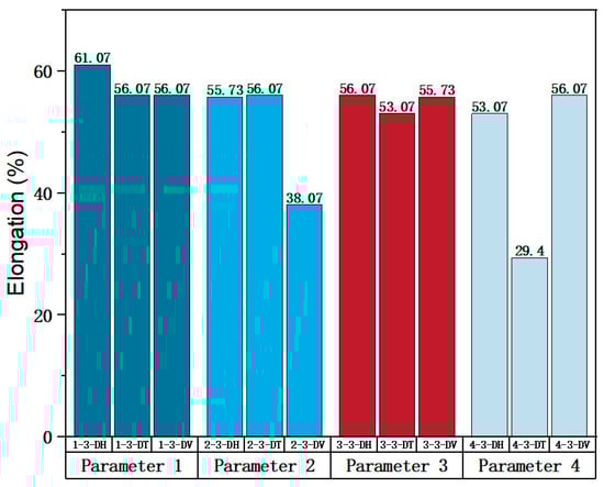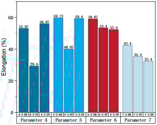 From the perspective of the proximity of stress-strain curves, the stress-strain curves in the three directions of Parameter 3 are closer. This means that among the specimens printed with these four groups of parameters, the specimens printed with Parameter 3 tend to be more isotropic. In addition, according to the mechanical properties’ indexes, the average yield strength, tensile strength, and elastic modulus of specimens in different directions of Parameter 3 were 490.57 MPa (the largest in the four groups), 861.09 MPa (the largest in the four groups), and 119.46 MPa (the second largest in the four groups), respectively. In addition, a comprehensive analysis of the elongation of a specimen with Parameter 3 in Figure 21 shows that the values for elongation in the three directions of ‘H’, ‘T’ and ‘V’ were 56.07%, 53.07%, and 55.73%, respectively, all of which are relatively high. Although the elongation of Parameter 1 is slightly higher, the specimen exhibits some anisotropy in the three directions of Parameter 1. The elongation in the ‘H’ direction is 61.07%, which is 5% higher than the other two directions. Therefore, from a comprehensive analysis perspective, the mechanical properties of Parameter 3 specimen are superior.