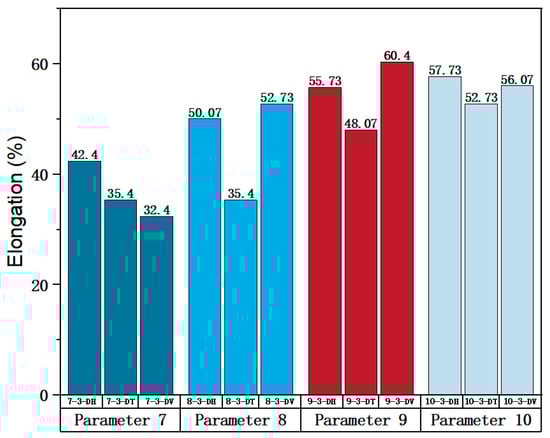 From the perspective of the proximity of stress-strain curves, the stress-strain curves of Parameters 7 and 10 in three directions are closer. Therefore, the specimens printed using Parameters 7 and 10 tend to be more isotropic. It can be observed from Figure 23 that the tensile properties of the specimen printed with Parameter 10 exhibit less variation in three directions and are significantly superior to the elongation of the specimen printed with Parameter 7. In terms of mechanical property indices, the average yield strength, tensile strength, and elastic modulus of specimens in different directions of Parameter 10 reached 453.38 MPa (the largest in the four groups), 852.54 MPa (the largest in the four groups), and 127.74 MPa (the smallest in the four groups, but differs little from the elastic modulus of the other three parameters, and differs by only 9 GPa from the maximum), respectively. Therefore, from a comprehensive analysis perspective, the mechanical properties of Parameter 10 specimen are superior.