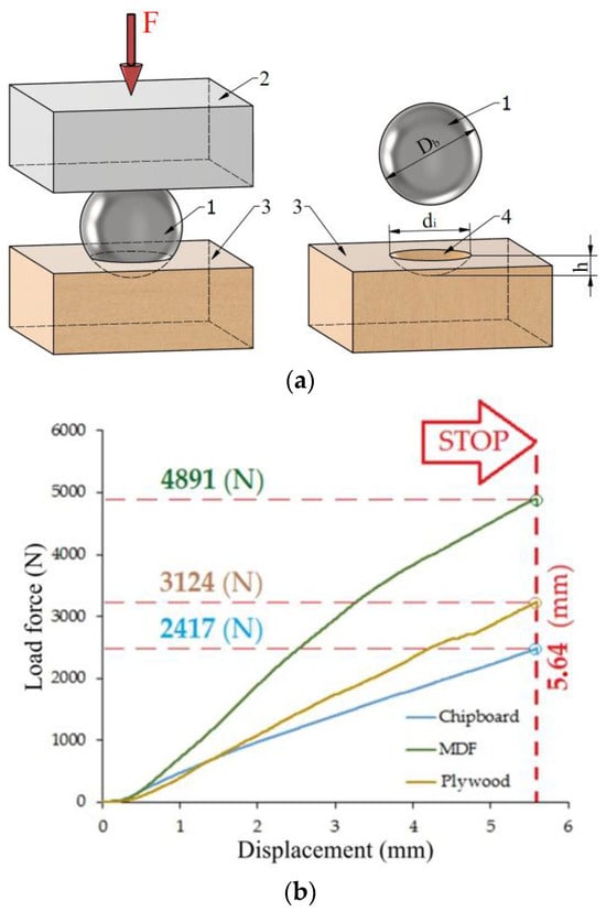 The Janka hardness value (Figure 2) was determined using a Janka ball test with a steel ball with a diameter of 11.28 mm, according to ASTM D 1037 [] standard. The load was applied continuously throughout the test, with a uniform speed of movement of the moving crossbar of the universal testing machine of 5 mm/min. As a measure of hardness, the maximum load required to push the ball into the wood to a depth of half the ball’s diameter was recorded. The materials used in the research are characterized by a clear variation in material density in the cross-section [], which results from their characteristic multi-layer structure.